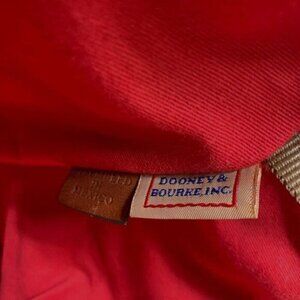 New without tags Dooney & Bourke nylon shopper tote in black water resistant nylon with smooth British Tan dual leather handles and trim. Snap closure. Handle drop length: 9.75". One inside zip pocket. Two inside slip pockets, one with a snap and loop closure, ideal for a cell phone. Inside key hook. Lined in red cotton twill fabric.