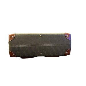 Dooney & Bourke shoulder bag features a rich olive green fabric body paired with sturdy brown leather trim and top handles for timeless, rugged elegance. Gold-tone hardware adds a luxe touch, while the structured shape and durable construction make it a practical yet stylish piece. Tan interior lining with Interior pockets. Approx. Measurements: Length: 13 in, Height: 7 in, Width: 5 in. Condition: Excellent | Color: Olive Green with Brown Leather Trim