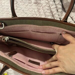Elegant olive tote with rich brown leather trim. Ideal for everyday use.