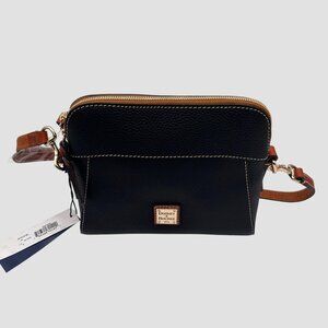 Dooney crossbody bag, black leather bag, pebble leather purse, gold hardware bag, designer small bag, zip closure purse, versatile crossbody, durable leather bag, stylish women's bag, compact everyday bag, leather shoulder bag,
