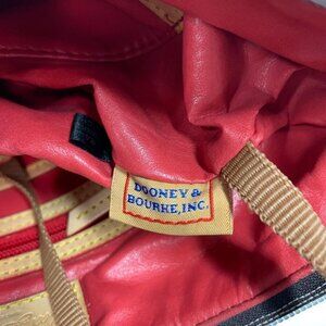 A handsome brown leather Dooney & Bourke Kimberly crossbody shoulder bag. Features include dark brown pebble grain leather with smooth British tan trim and D&B medallion in front. A top zip closure opens to red wipeable nylon lining, 3 slip & 2 zip pockets and a leather key fob. The exterior of the bag has 2 front slip pockets. A shoulder strap and removable crossbody strap allow the bag to be worn on the shoulder or across the body. Excellent preowned condition other than light cosmetic wear to one corner. See photos for more details. Happy to answer any questions!