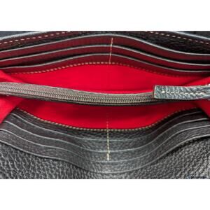 VTG: Stylish, black pebble grain leather bifold wallet/clutch with flap snap closure / contrast stitching / signature interior red fabric / multiple card slots, zippered pocket, & billfolds / rectangular shape / iconic etched logo plaque by Dooney & Bourke.