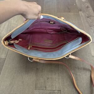 The Dooney & Bourke Pebble Grain Shopper Tote in Gray is a stylish and practical handbag designed for women. Made from leather with a pebbled finish, this tote features a zip closure, brown handles/straps, and a red lining. Ideal for casual occasions, this tote also includes pockets for added functionality. The iconic Dooney & Bourke brand and designer theme make this tote a fashionable and timeless accessory for any wardrobe.