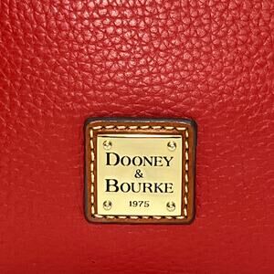 Classic and timeless Dooney & Bourke crossbody bag crafted from durable pebble leather in a striking red with contrasting brown trim. Features an adjustable strap for versatile wear, a top zip closure, front slip pocket, and signature Dooney & Bourke metal logo plate. The interior is fully lined with additional pockets for organization. Style number and authenticity tag present inside.