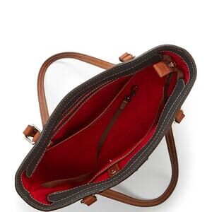 Dooney & Bourke Lexington black pebbled medium size handbag purse from the pebble collection. Still sold in Dillard's current style for $328. This purse is in excellent condition very minimal signs of wear no major damages very little scuffing on bottom corner see photos for description two slider pockets inside a zipper pocket inside red interior gorgeous white stitching black and camel colored leather.
