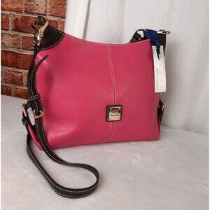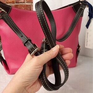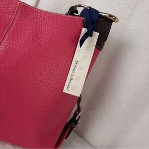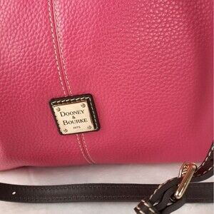 Elevate your style with the Dooney & Bourke Pink Leather Crossbody Bag. This chic accessory features a vibrant pink hue, perfect for adding a pop of color to any outfit. Crafted with high-quality leather, it offers both durability and elegance. Ideal for everyday use, this bag combines fashion and functionality seamlessly. This is brand new and has never been used. Still have a hang tag from the manufacturer. The outside features a beautiful pink full grain pebbled leather design, rich brown leather trim and straps, and a removable and adjustable Crossbody strap. The inside is that classic Dooney and Bourke pink fabric lining that is spotless with two slip pockets and a zipper pocket. The certificate of authenticity is included, and free shipping.