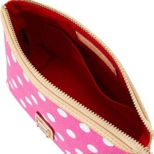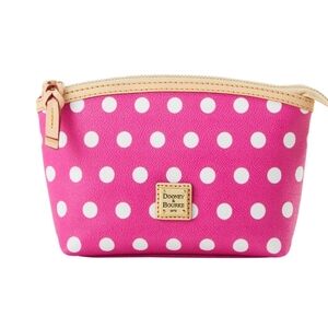 Chic pink pouch with white polka dots. Features a Dooney & Bourke logo. Perfect for organizing essentials.