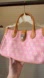 Excellent condition some minor wear as shown in photos Pink and tan Monogram print Cloth material Clasp front close Inside pockets and zip closure Key clasp inside Metal feet Removable shoulder strap