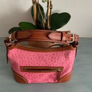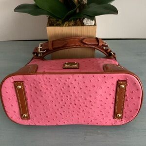 Stylish and elegant, this Dooney & Bourke bag features a vibrant pink body with classic brown accents. Perfect for any occasion, it combines fashion with functionality.
