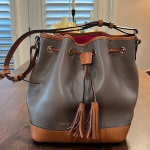 Dooney & Bourke Platinum Pebble Leather Bucket Bag Tassel Drawstring Tan