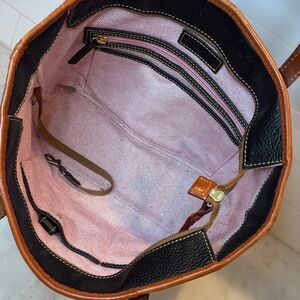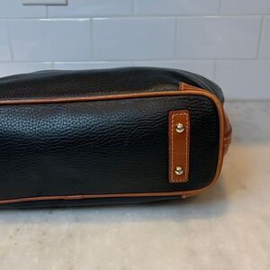 Designer authentic Dooney & Bourke Charleston tote is large and spacious. Great for a person who likes to take along all of their "stuff." The pebbled leather is in great condition and very easy to clean. The brown accented leather has a beautiful patina. The interior looks good. Be sure to look at the photos for a detailed description. Inside the bag, there are 3 slip pockets, 1 zipper pocket and key strap too!! Approx- 12x4x10 strap drop 8.5" Ask questions and make an offer!