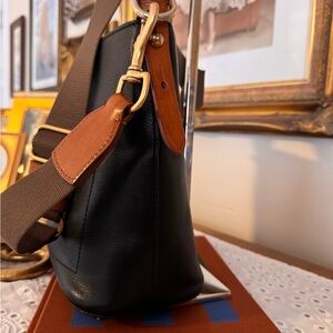 Design: A bucket-style crossbody bag with a structured silhouette.