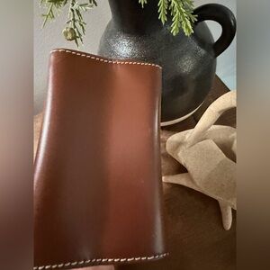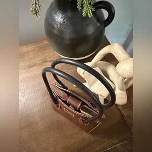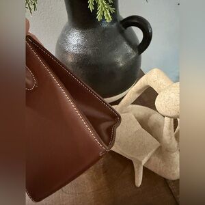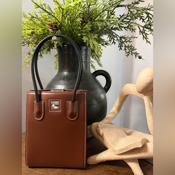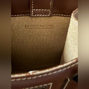This Rare Dooney & Bourke mini bag is crafted in soft brown leather. It features black handles with a snap closure and the metal Dooney & Bourke plaque on the front. The interior is lined in a soft suede-like fabric with the Dooney & Bourke stamp inside.