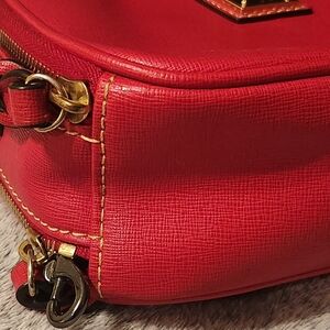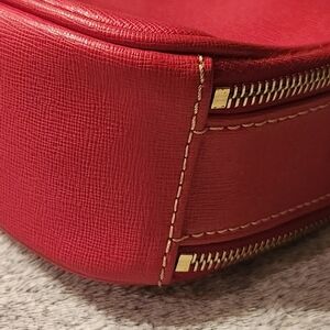 Stylish red crossbody bag. Features gold-tone hardware. Perfect for everyday use.