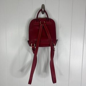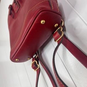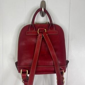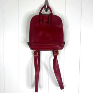 Stylish red leather backpack. Features top handle and adjustable straps. Iconic Dooney & Bourke logo.
