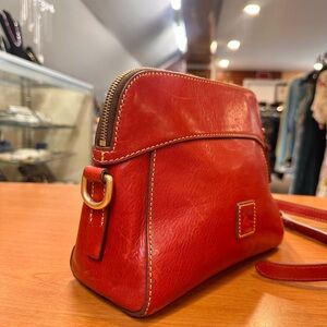 Dooney & Bourke chic red Florentine leather crossbody bag with adjustable strap. Sleek design with gold-tone hardware. Perfect for daily use!