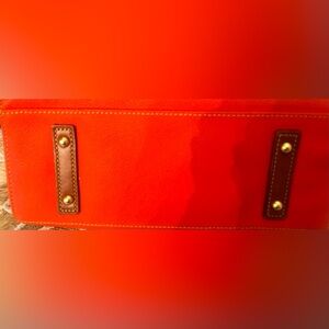 Elevate your style with the Dooney & Bourke Red Leather Tote Bag Slight Staining in front of bag. This chic accessory features a vibrant red hue, perfect for adding a pop of color to any outfit. Crafted with premium leather, it offers both durability and elegance. Ideal for everyday use, this tote combines fashion and functionality seamlessly.