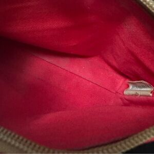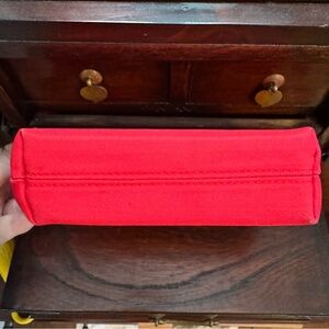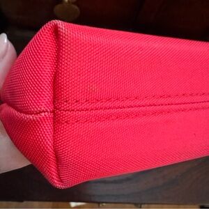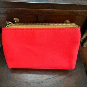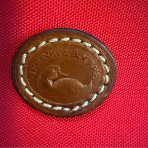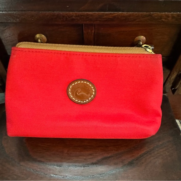 Classic Dooney & Bourke small zip pouch in bright red nylon with tan trim and signature duck logo leather patch. Perfect for cosmetics, coins, or everyday essentials.