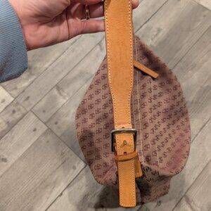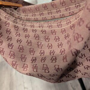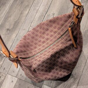 Gorgeous Dooney & Bourke signature canvas hobo in a red / wine logo print with tan leather trim and strap. Classic DB all-over monogram, super soft slouchy shape and easy shoulder carry – perfect everyday bag that still looks polished.