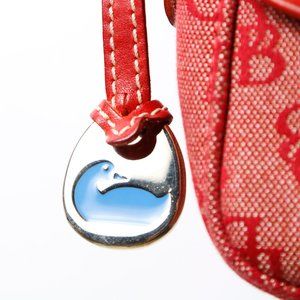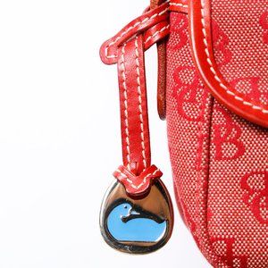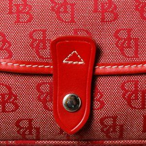 This is a super cute Dooney & Bourke small red cross body. It is perfect the perfect little bag for handsfree shopping or just being on the go! It features a snap closure, gold hardware, red leather strap and snap closure, back slit pocket