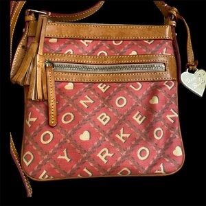 Stylish Dooney & Bourke crossbody bag in red and tan. Features a zip pocket and tassel detail and a nice Dooney hang charm! Really cute bag!! Inside looks good as well! Classic Dooney and Bourke.