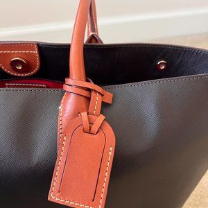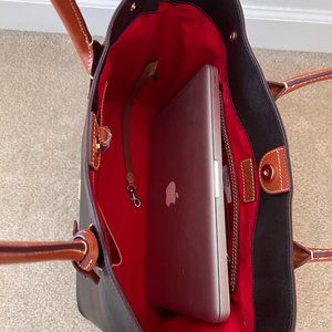 BRAND NEW Dooney and Bourke Shopper Tote. Chocolate brown/amber body with red canvas lining and camel brown leather shoulder straps. Purchased at a Dooney and Bourke Sample sale, and never used. There is still protective paper on some features. Perfect tote for work (MacbookPro 13in fits with ease, 15in would also fit) , a weekend trip, baby items, or everyday. It is stiffer in texture so holds shape incredibly well. One exterior zipper pocket and multiple organizational pockets inside. Metal brads protect the bottom of the bag from wear and tear. Beautiful bag in new condition.