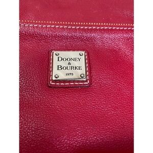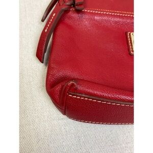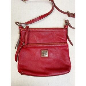 Red leather crossbody bag by Dooney Bourke - has zip closure and one exterior zip pocket, one interior zip pocket and small interior slip pocket- clip for keeping keys safe and easy to find- in very good pre owned condition with some signs of wear especially to the corners of the bag, please see photos -