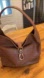 Dooney & Bourke Samba Loc Sac brown pebbled leather hobo style shoulder bag. This is a nice larger size and is in good preloved condition. Measurements in photos. First pic is stock photo, the rest are the actual bag for sale. Some minor interior marks, and two of the four corners show a little bit of where as photographed. Measurements are at base 12” wide and 5” deep. Height is 12 inches but because of the front clap that folds down a little bit in the center to approximately 10 inches, bag tapers wider towards the middle and is approximately 17 inches wide at the widest. This is a nice larger shoulder bag and the pebbled leather is beautiful, strap drop with the bag class is approximately 10 1/2 to 11 inches. A little hard to measure because of the slouchy silhouette of this bag.