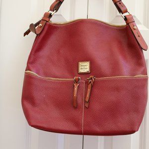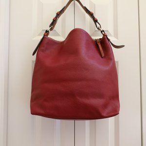 Beautiful cranberry colored Dooney & Bourke satchel. Excellent condition. Shows very minor wear at bottom seams (where the leather comes to a point). Very large inside with slots for phone and other goodies.