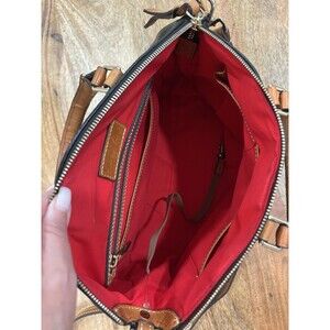 The Dooney & Bourke Satchel Black Leather Crossbody Handbag is a stylish and versatile accessory for women. Made of pebbled black leather, it features a solid design with gold hardware accents. The bag has a medium size with a zip closure and double handles as well as a crossbody style for added convenience. Perfect for travel, casual outings, or business meetings, this satchel/top handle bag is both practical and chic, with a fabric lining in red for a pop of color. Add a touch of sophistication to your outfit with this timeless and high-quality handbag from Dooney & Bourke.