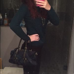Emerald Green, Navy, and Black colored Dooney & Bourke satchel. Perfect winter purse! I used this purse maybe 3 times and it has been sitting in my closet ever since. This is a beautiful purse, but I've outgrown it. It's just not my style anymore. But it could be perfect for you. (: Email me for a cheaper price. Falala51@hotmail.com