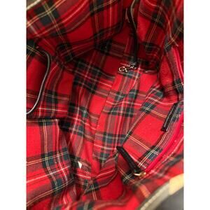The interior is lined in classic red plaid fabric with multiple pockets and a top zip closure for security. Gold-tone hardware and a bone-shaped Dooney hang tag complete this nostalgic design. Perfect for dog lovers, travel, or everyday wear!