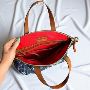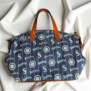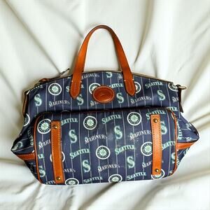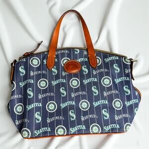 Dooney & Bourke satchel with the Seattle Mariners logos all over it. It's got brown leather handles and trim, and it's a fun way to show off your Mariners pride. Used but still in good shape, perfect for any fan who wants something a little different than the usual gear.