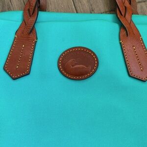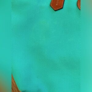 Dooney & Bourke Shopper Tote. In previously loved condition. Signs of wear shown in photos. There are some spots on the front from spot cleaning. The spots are hard to see I tried to capture them the best I could. The color is name is “Mint”. This is such a great beach/pool tote which is what it was used for!!