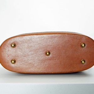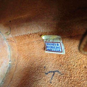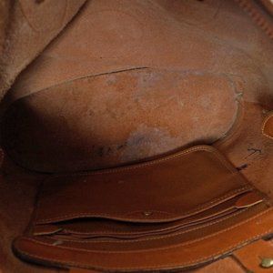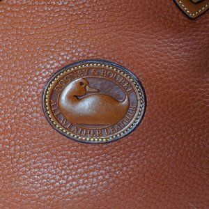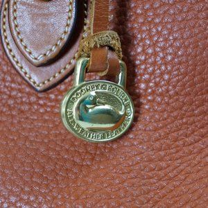 This classic beauty is made with the thick and soft all-weather leather from Dooney & Bourke. The outside is in excellent condition with only a minor mark on the bottom. You have to really look for it. Inside there are stains and it does have 2 removable pockets with zipper compartments. The shoulder strap has not been used and still retains some of its original stiffness. The color is an orangey tan. Pebbled texture. Made in USA.