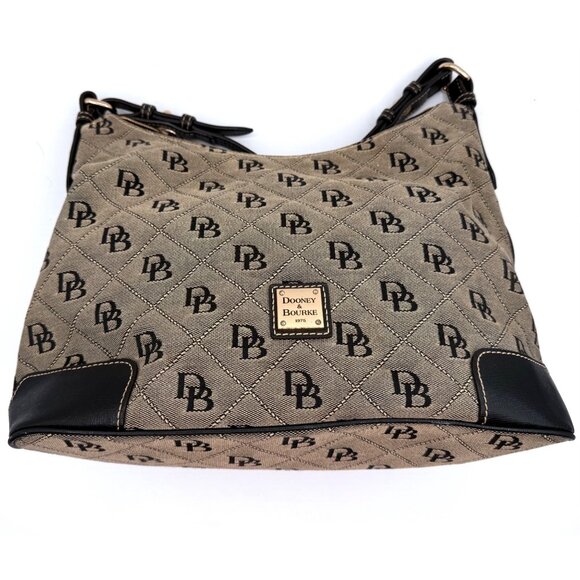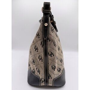 Classic Dooney & Bourke signature logo canvas shoulder bag in a timeless neutral tone with black leather trim. A great everyday bag with the quality construction D&B is known for.