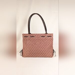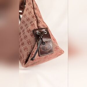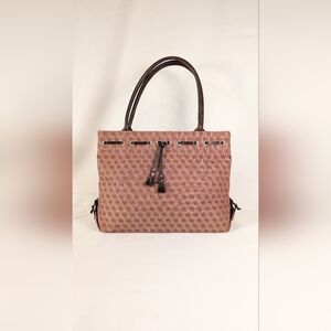 Dooney & Bourke signature monogrammed tassel tote in a subtle shade of burgundy canvas. Rich brown leather handles and accents. Interior has several slip pockets.