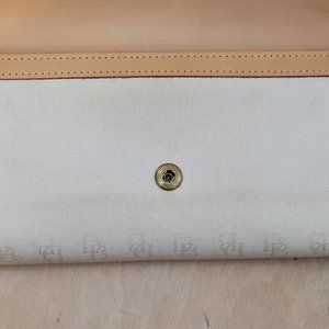 Dooney & Bourke Signature Monogram Tri Fold Wallet Cream Canvas Tan Leather Trim