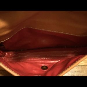 Pre-loved Dooney & Bourke Signature Flap Wristlet -- pink with gold stitching. Minor wear and tear, but in good condition overall. No noticeable marks, tears, or damage.
