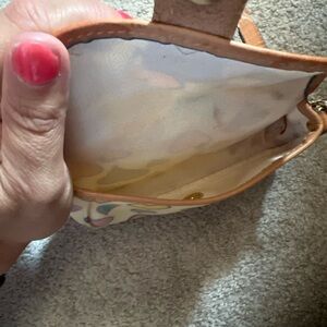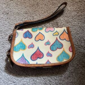 Charming wristlet with a colorful heart pattern, perfect for adding a playful touch to any outfit. Features a convenient strap for easy carrying.