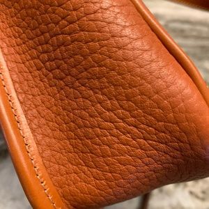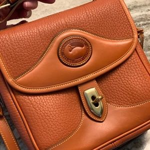 Dooney & Bourke Surry Equestrian Pony Express bag is beautiful. A7 735631. The top quality leather in British Tan with shiny brass hardware. Stunning detail and design. Lots of room inside and measures 8 x 9 x 3 1/2 inch. Crossover adjustable strap with handle. Exterior slit pocket with interior slit and zip pockets. Perfect condition.