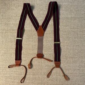 Dooney & Bourke suspenders featuring burgundy grosgrain ribbon fabric with tan leather button-on ends and gold-tone hardware. Gentle signs of wear but overall excellent condition, crafted for refined style.