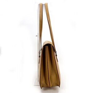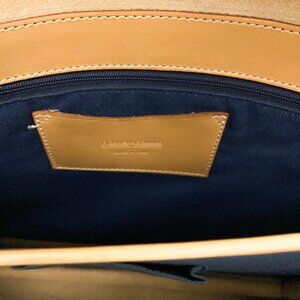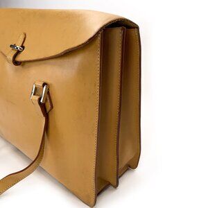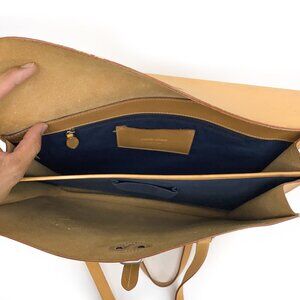 This vintage Dooney & Bourke brief bag has a tan leather exterior with silver tone hardware. The spacious interior has 1 blue lined canvas zipper pouch that has a slot for business cards, 1 blue lined canvas center divider that has a small open pouch for a small cell phone or other small personal items. It also, features a hook and loop closure, making it easy to organize and access your documents, laptop, and other essential items. The double leather handles make it comfortable to carry, whether you're heading to the office or a business meeting.