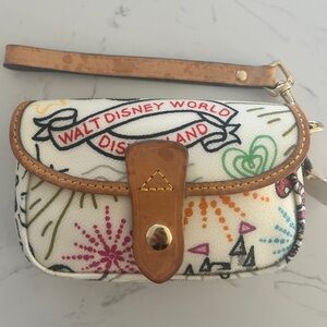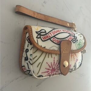 Add a dash of pixie dust to your day with this Dooney & Bourke Disney Sketch Wristlet featuring Tinker Bell. The playful all-over print includes musical notes, fireworks, and Disneyland icons. Crafted with a leather snap closure and detachable wrist strap, it’s the perfect size for cards, cash, or small essentials.