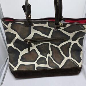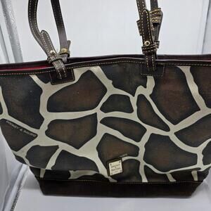 This Dooney & Bourke tote bag in a charming brown color is a must-have for any stylish woman. The exterior is made of high-quality leather, ensuring durability and longevity. The bag features a spacious interior, making it perfect for carrying all your daily essentials. The giraffe pattern adds a touch of playfulness to the design, making it a great addition to any wardrobe. Whether you're running errands or heading to work, this bag will keep your belongings organized and secure.