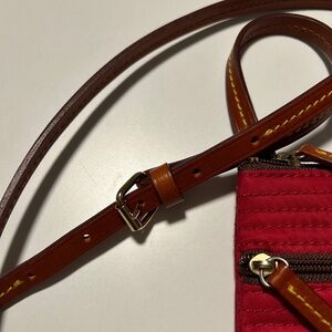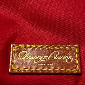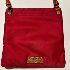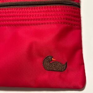 Wonderful crossbody bag in a vibrant red nylon material with classic Dooney Duck Embroidered on front