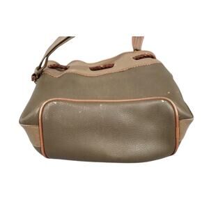 Vintage Dooney & Bourke All Weather Leather drawstring shoulder bag in taupe with tan trim. Features pebbled leather body, smooth leather accents, classic Dooney duck fob, and green suede-lined interior. Adjustable leather strap, drawstring closure, and roomy interior with slip pocket. Measures approx. 11” H x 10” W x 6” D with 11” strap drop.