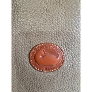 This Dooney & Bourke pebble leather bucket bag features a drawstring closure and adjustable strap for versatile carrying options. Its spacious interior makes it a practical choice for everyday use, while the tan and brown color palette offers a classic and timeless aesthetic.