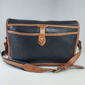 Vintage Dooney & Bourke All Weather Leather messenger crossbody bag. Made in USA in a classic black pebbled leather with brown bridle leather trim and brass hardware. Features a front flap with buckle strap closure, an exterior slip pocket, and an organized interior with zippered and slip pockets. Adjustable leather strap for shoulder or crossbody wear.
