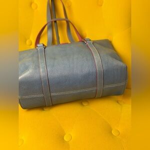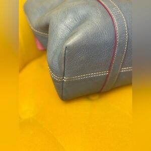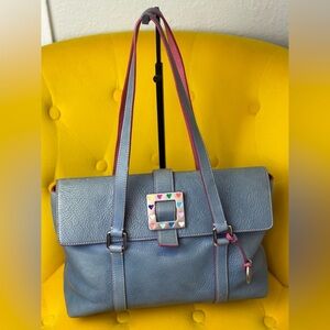 Elevate your style with this chic blue leather tote bag. Perfect for any occasion, it features a unique heart-accented buckle. Ideal for fashion-forward individuals bag is in poor condition color discoloration, corners rubbed inside dirty see photos thank you.